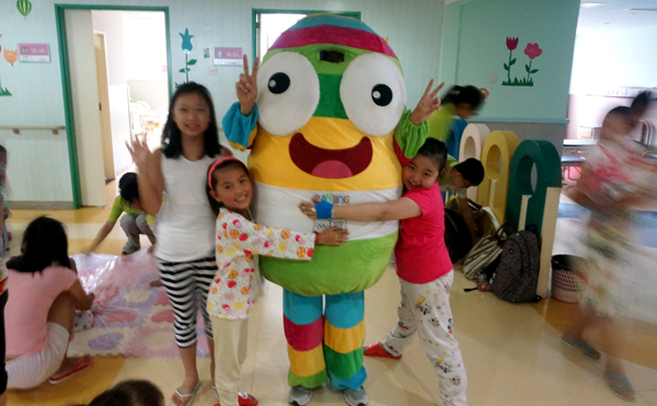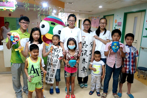8月9日下午,来自南京农业大学的青奥志愿者们带着青奥会吉祥物砳砳一起来到医院,开展了以“中国文化”为主题的住院患儿病房陪护活动。
