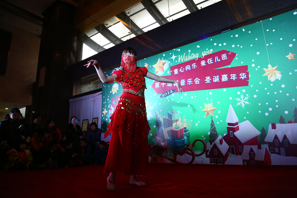 音乐会上,志愿者们表演了短剧《最美的风筝》、弦乐三重奏《夜来香》以及圣诞歌曲联唱、舞蹈《金翅舞》等节目,美妙的歌声、妙曼的舞蹈、唯美的背景,赢得了家长和小朋友们的阵阵掌声。演出期间,医院住院部大厅到处洋溢着喜庆的节日氛围,随后志愿者们向小朋友赠送了丰富的节日礼物。