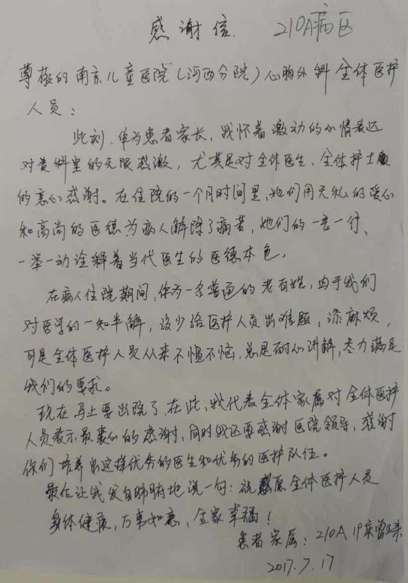 尊敬的色色啦 (河西分院)心胸外科全体医护人员:此刻,作为患者家长,我怀着激动的心情表达对贵科室的无限感激,尤其是全体医生、全体护士的衷心感谢。