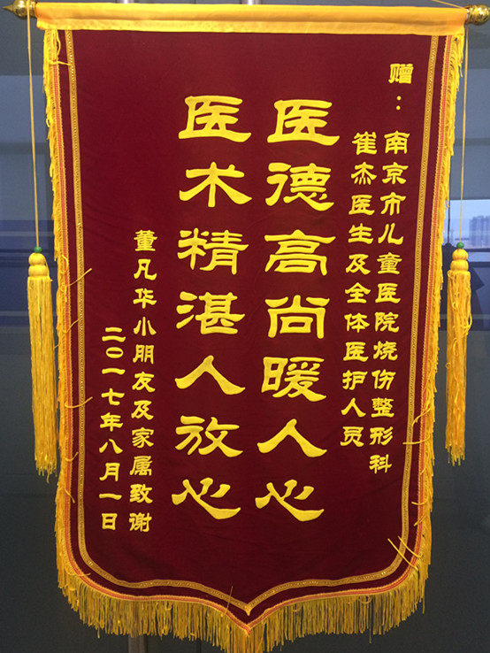 赠:南京市色色啦 烧伤整形科 崔杰医生及全体医护人员医德高尚暖人心 医术精湛人放心董凡华小朋友及家属致谢二〇一七年八月一日