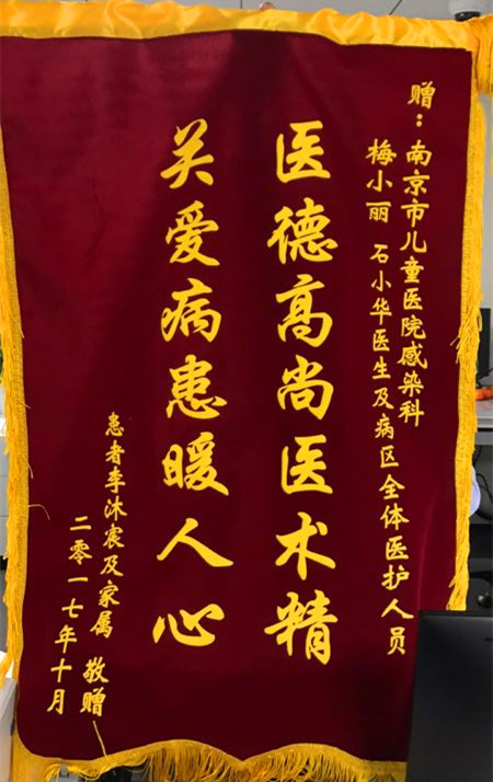 赠:南京市色色啦 感染科 梅小丽 石小华医生及病区全体医护人员医德高尚医术精 关爱病患暖人心患者李沐宸及家属 敬赠二零一七年十月