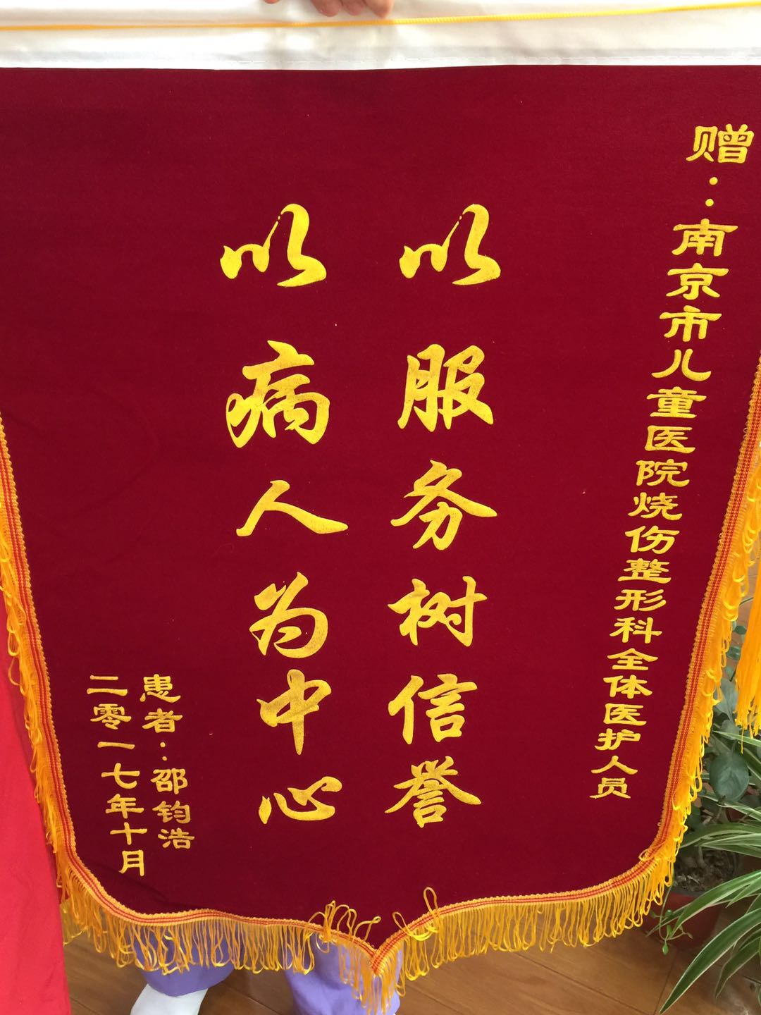 赠:南京市色色啦 烧伤整形科全体医护人员以服务树信誉 以病人为中心患者:邵钧浩二零一七年十月