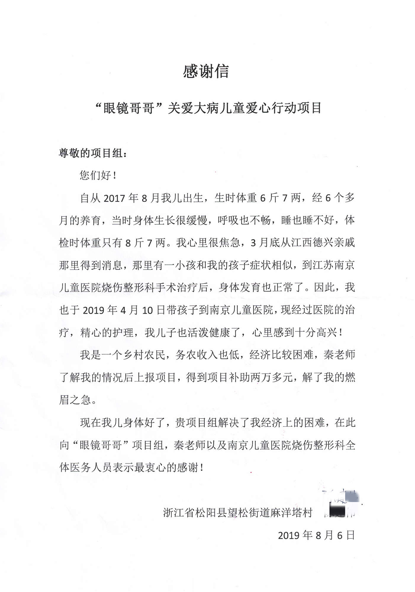 感谢“眼镜哥哥”关爱大病儿童爱心行动项目