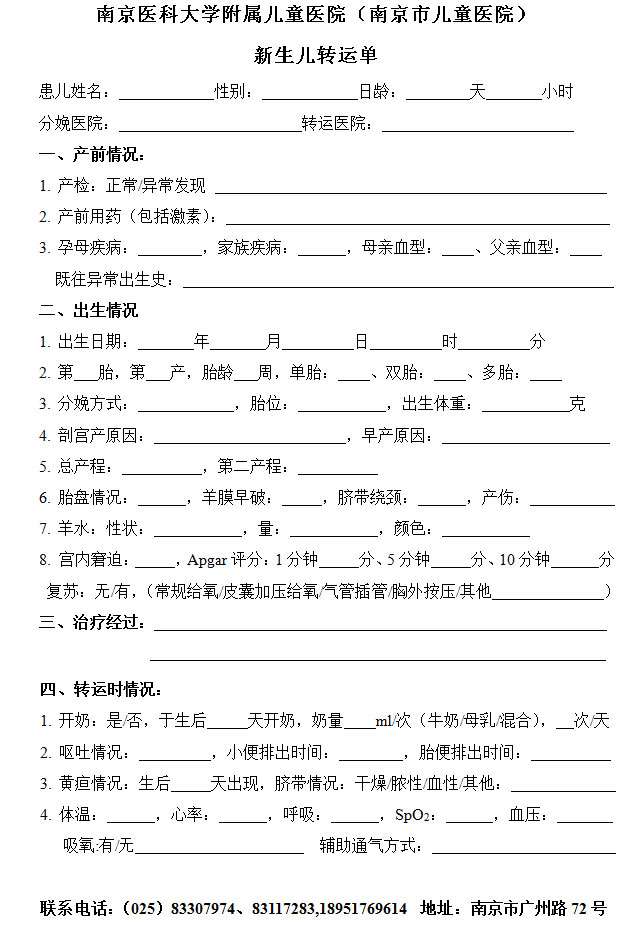 色色啦 | 就医指南 | 新生儿转运指南 | 转运单