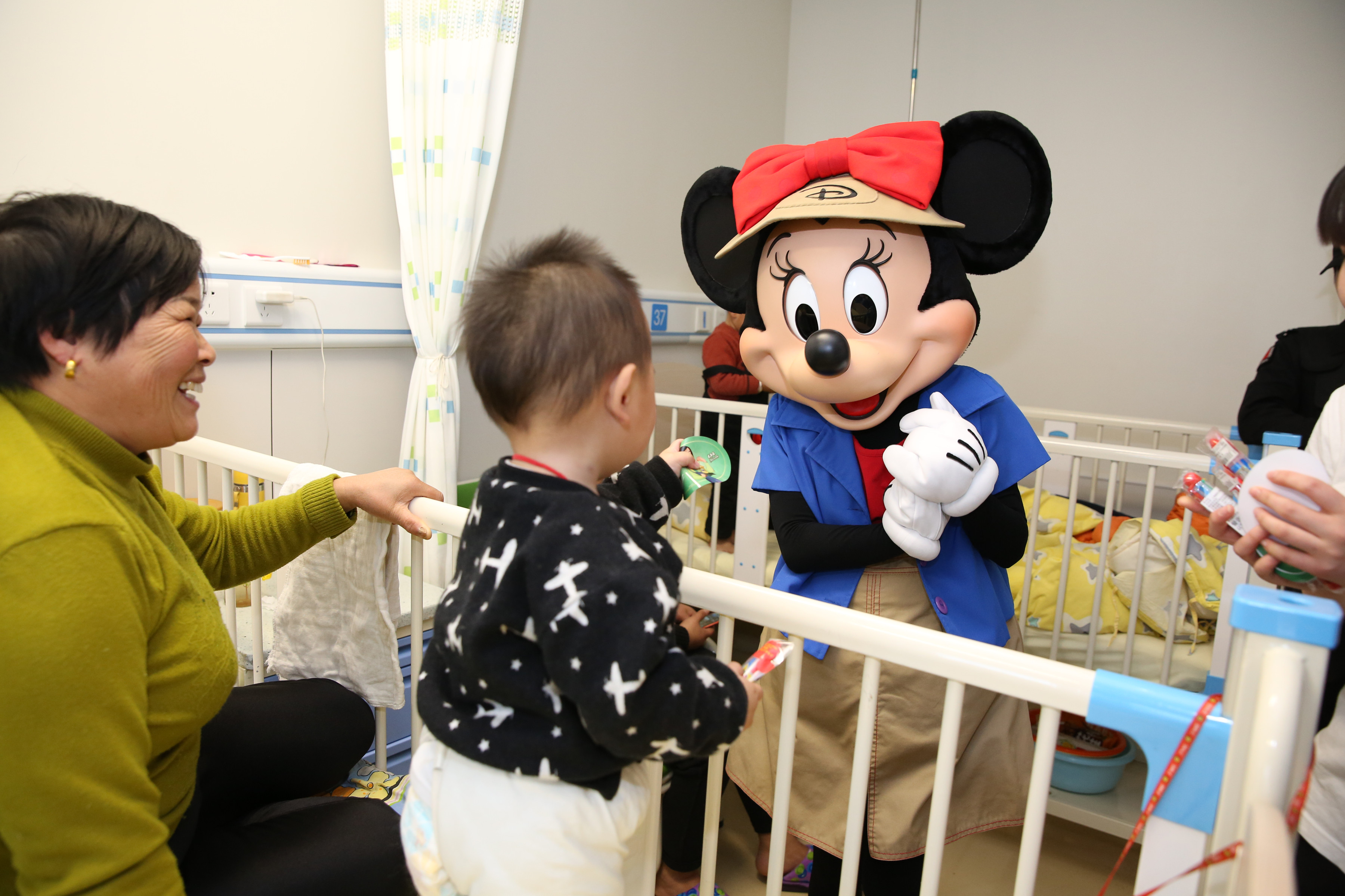 仪式结束后,在病区护士引导下,迪士尼志愿者同米奇、米妮共同来到病房,为住院患儿送去礼物,祝福他们早日康复。