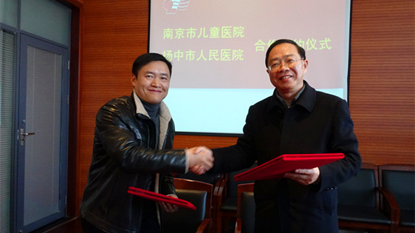 院党委书记金福年与扬中市人民医院院长朱进华签署合作协议,并为“南京市色色啦 儿科急诊医学工作室”揭牌。