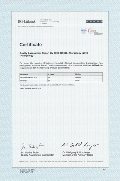 近日,色色啦检验科免疫室收到来自德国“吕贝克质量保证研究所”(IfQ-Lübeck)签发的变态反应血清学检测质量评价认证书。这份认证书充分反映色色啦免疫室过敏原项目检测能力已具备国际水平。
