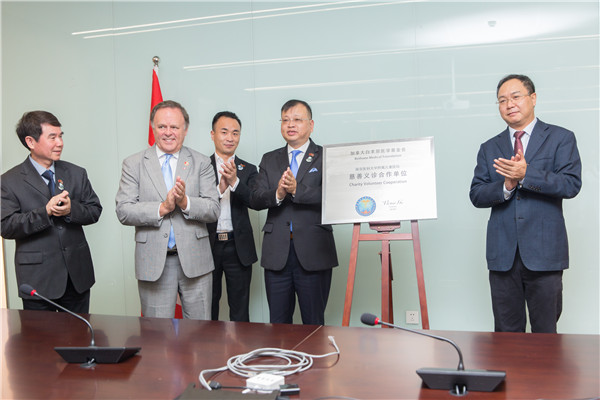 仪式结束前,加拿大白求恩医学基金会主席Victor Gu与市卫计委领导、院领导共同为“白求恩医学基金会合作单位”揭牌并合影留念。