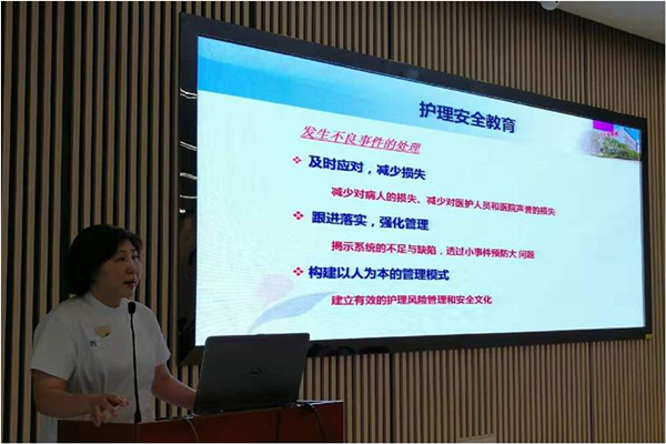 护理部浦凯副主任对2019年1-6月发生的护理不良事件进行总结,分享经验,分析不足。同时与2018年同期不良事件进行了对比分析,2018年1-6月排名前三位的不良事件:非计划性拔管、液体渗出(外渗)及静脉炎、护理给药缺陷,在2019年同期有了显著下降。此外,浦凯副主任重点汇报了2019年护理质量持续改进项目的落实。她指出,今年护理隐患报告逐渐增多,成为新的风险点,要求全院护理人员做到安全之弦紧绷不懈,不折不扣的守住日常工作的每一条安全底线。