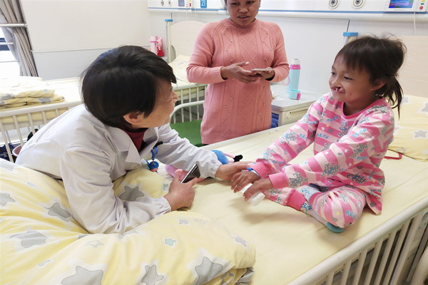 当接到两姐妹已经下高速的消息之后,我们早早地就在楼下等待。见小梅和小谷时,两个女孩子戴着口罩,黑黑瘦瘦,眼神闪躲,和她们打招呼,她们却一直往父母的身后躲。医务社工拿出小猪佩奇玩偶和她们搭话,"你看,它的裙子是红色的,和你的衣服是一样颜色哎,喜欢么?喜欢我就把它送给你",小谷害羞地点点头。两姐妹和社工姐姐很快就熟络起来,手拉手一起来到了烧伤整形科病房。