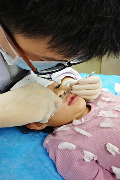 站在一旁的小梅看着做完手术的姐姐,也一遍遍将自己的嘴唇往中间压,比划着努力想象自己手术后的样子。