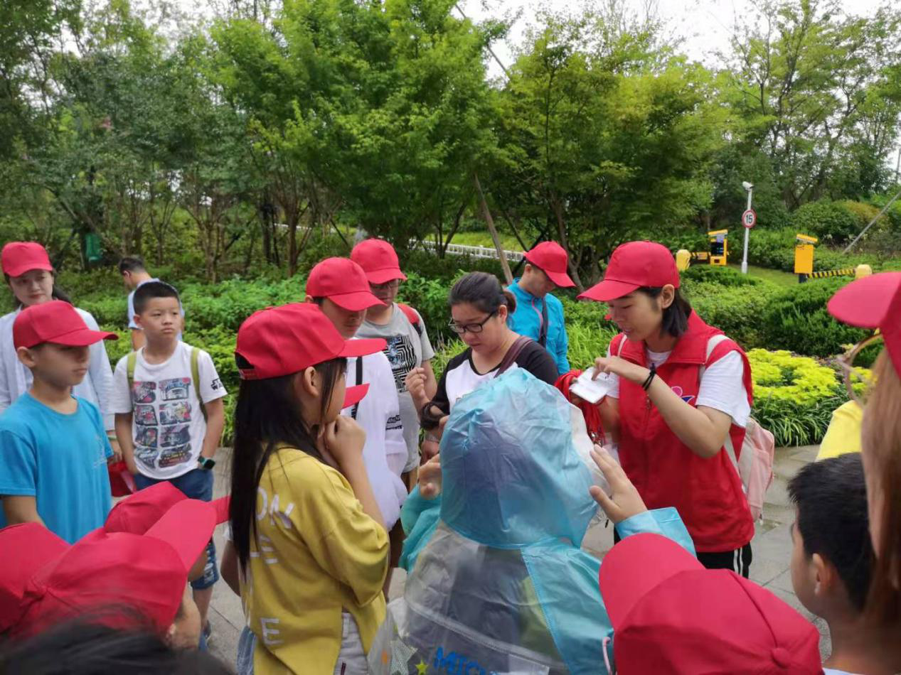 志愿者为小朋友们发放胸牌讲解安全事项
